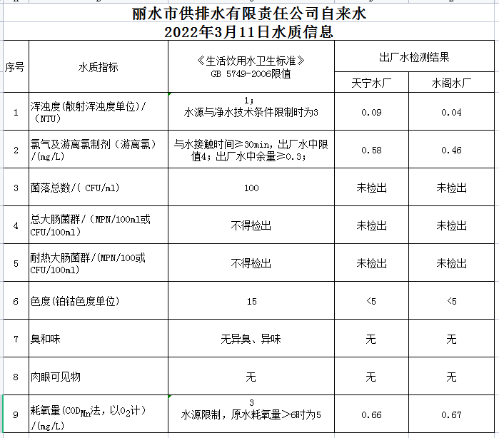 丽水市供排水有限责任公司自来水2022年3月11日水质信息